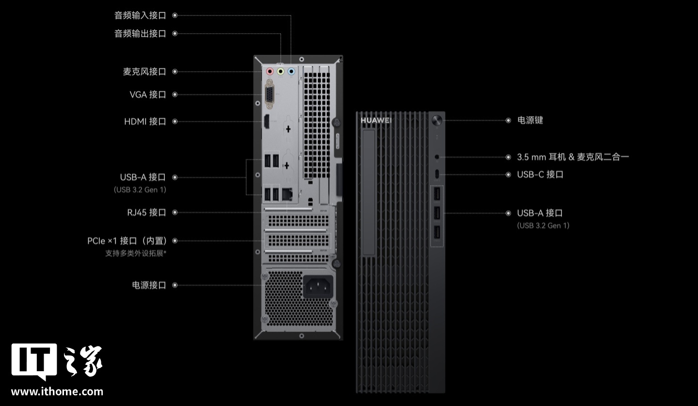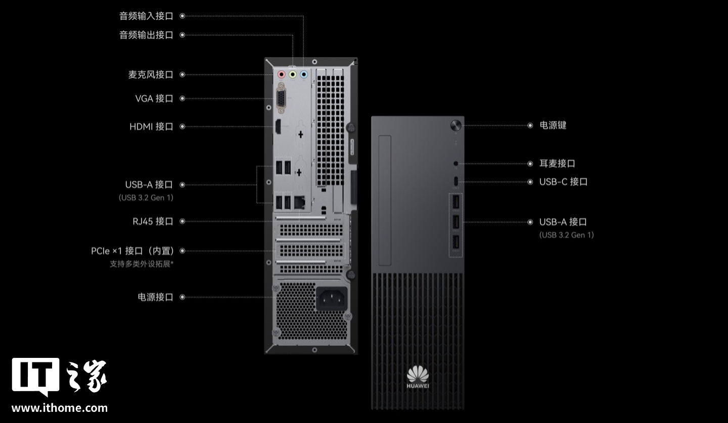华为擎云 W585y 同样是通过国家电子计算机质量检验检测中心“信息安全卓越级”验证的微型计算机,支持数据硬件级加密,实现“一文一密”加密方式,整机通过 CEL 1 级能效认证,每台主机的典型年耗电量约 85 kWh。该主机接口如下: