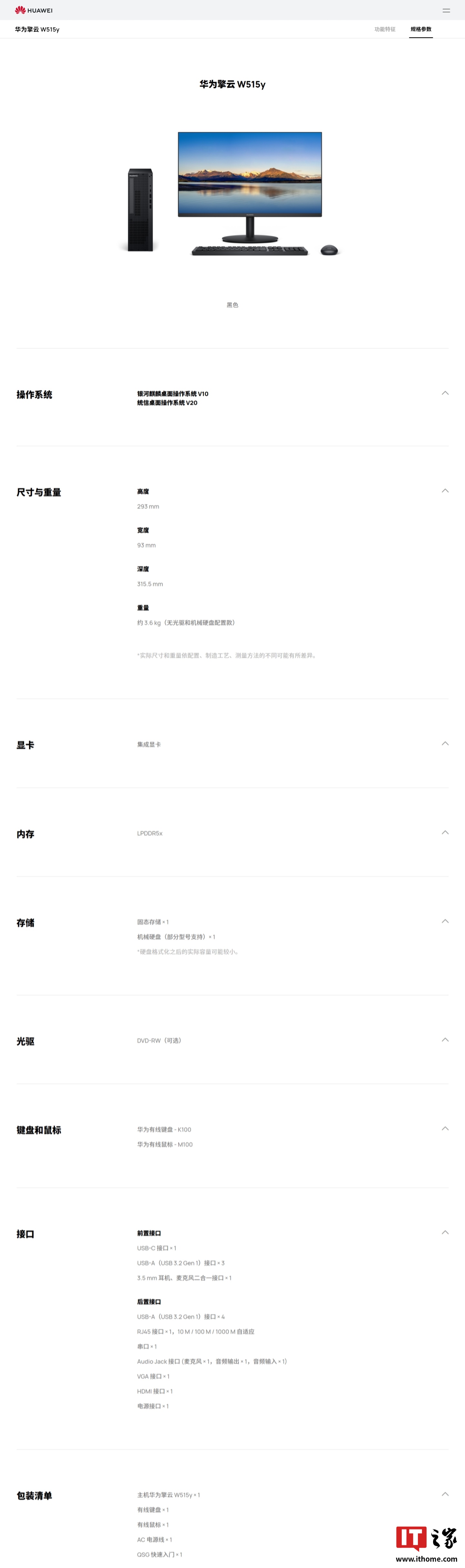 IT之家附华为擎云 W515y / W585y 台式机规格参数如下: