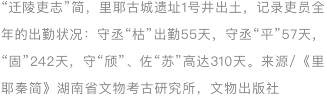 成为正式官吏后,也要接受严格的管理。里耶秦简的“迁陵吏志”显示,当地县府共有吏员130人,其中负责司法工作的令史有28人,来自某某地的服徭役者有18人。每名吏员全年的出勤状况也有记录:守丞“枯”出勤55天,守丞“平”57天,“固”242天,守“颀”、佐“苏”高达310天。